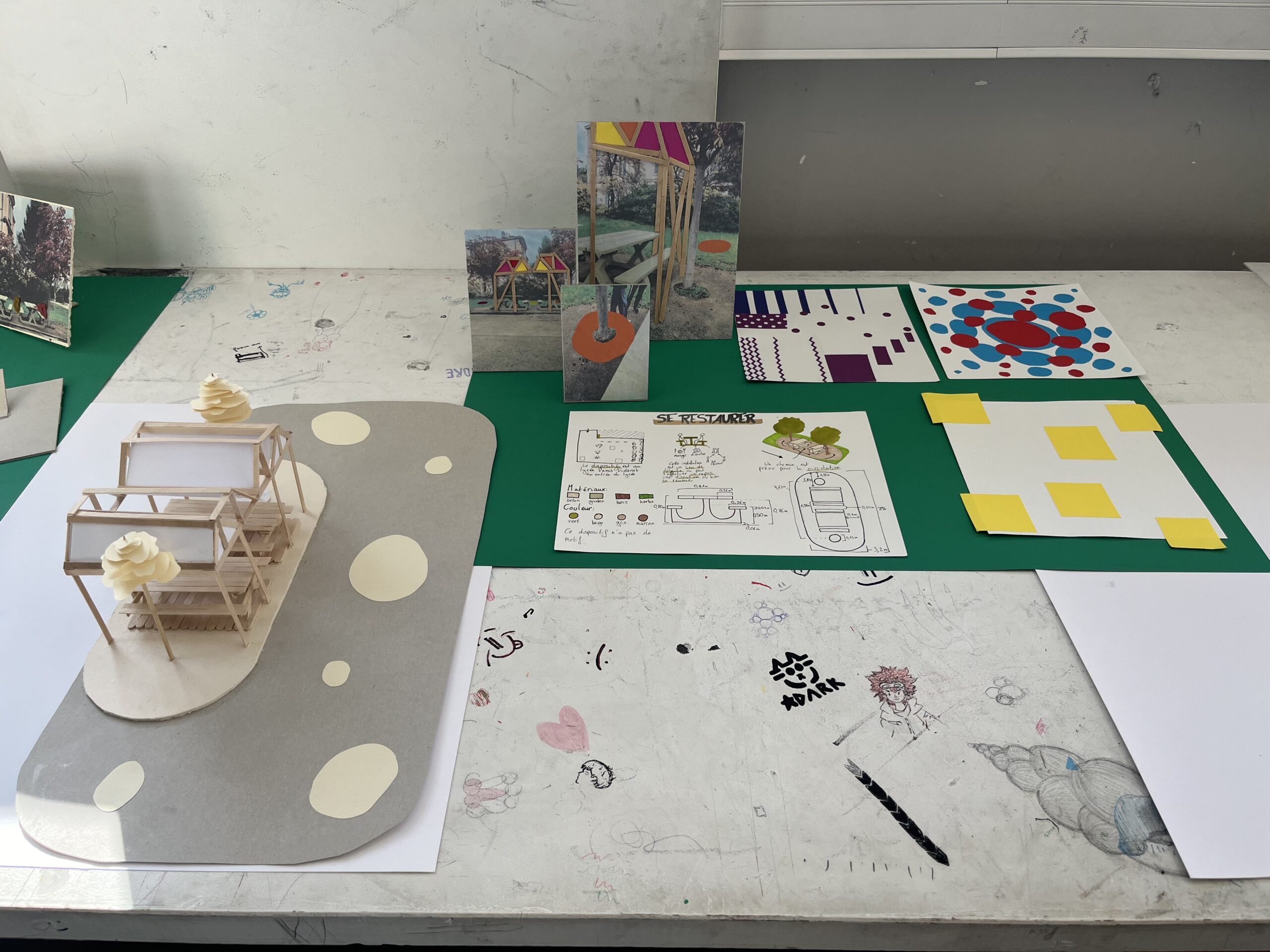 Idée principale : Créer un coin ombragé dans la cour du lycée pour y manger, sans avoir trop chaud. L’idée m’est venue en pensant aux endroits qui me font rêver, comme les jardins de l’Alhambra avec leurs coins frais et ombragés.